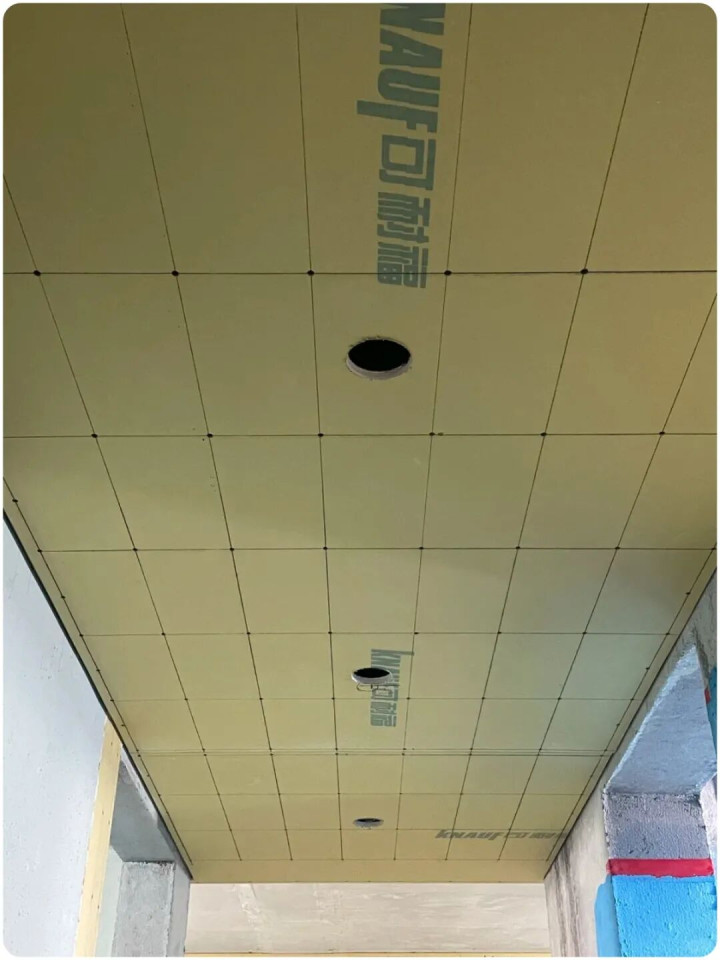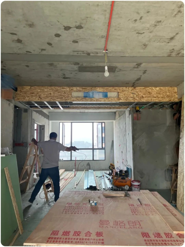 ▲所有其它项目做完,最后就是开灯孔,依据弹线避开主副龙骨,拉出里面电源线,清理下地面垃圾打包堆在墙角,完美收工。