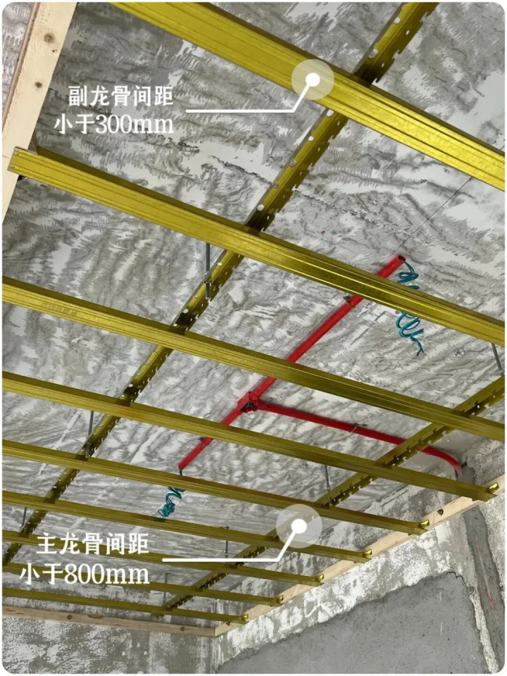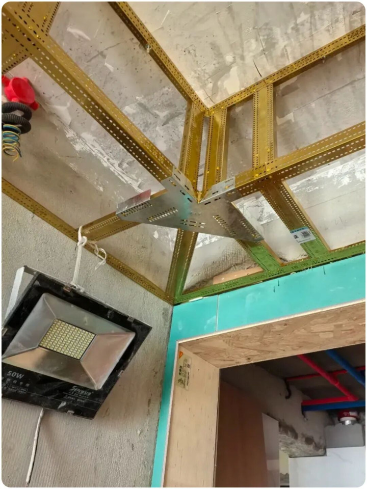▲轻钢龙骨吊顶直角拐角处须增加斜撑龙骨,或者专门的角码固定,为后期可能的开裂增加一份保障。