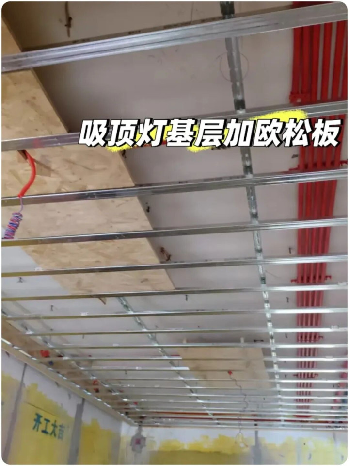 ▲吊顶上如悬挂吊灯、金属件等重物,位置又不是太确定,则须在吊顶上固定一定面积的欧松板,防止后期灯具位置偏差。
