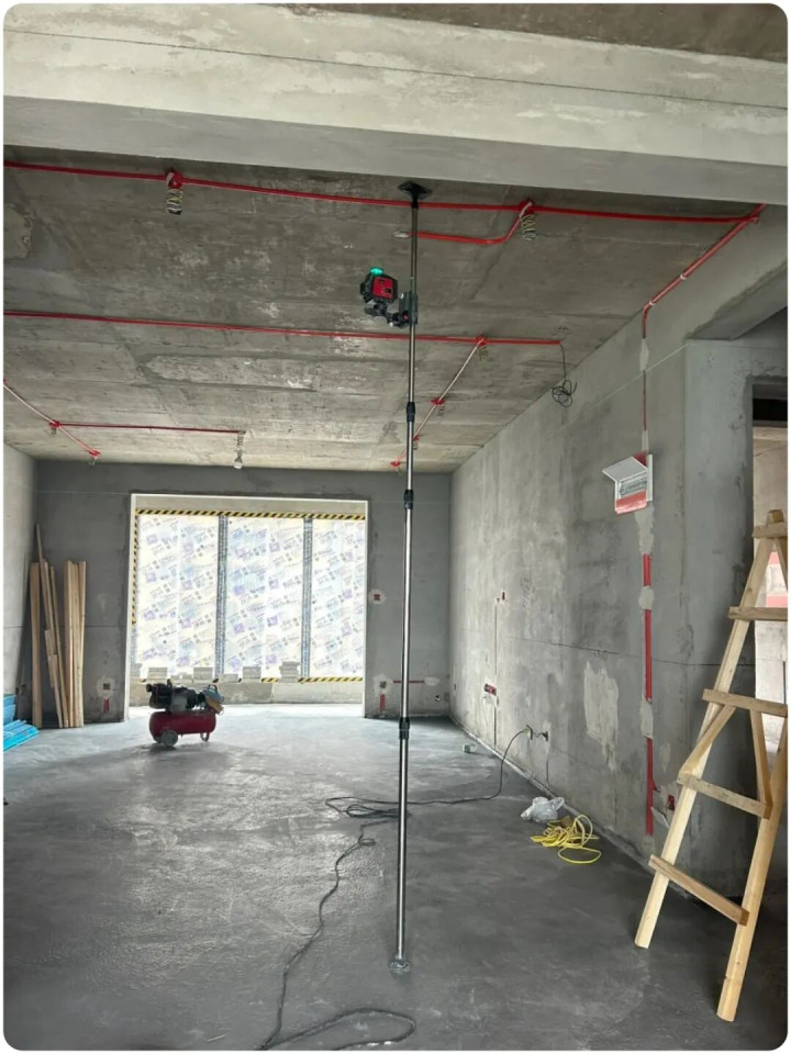 ▲根据图纸以及现场交底说明,弹好吊顶高度、深度水平线、窗帘盒位置水平线、墙面木饰面位置水平线,作为整体标高的依据。