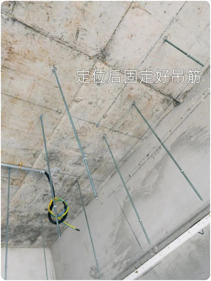 ▲吊杆固定必须使用专门的膨胀管,严禁使用炮钉,长时间使用不安全。吊杆与吊杆之间间距不大于800mm,如吊顶某处有重物悬挂,须加设吊杆,确保牢固。