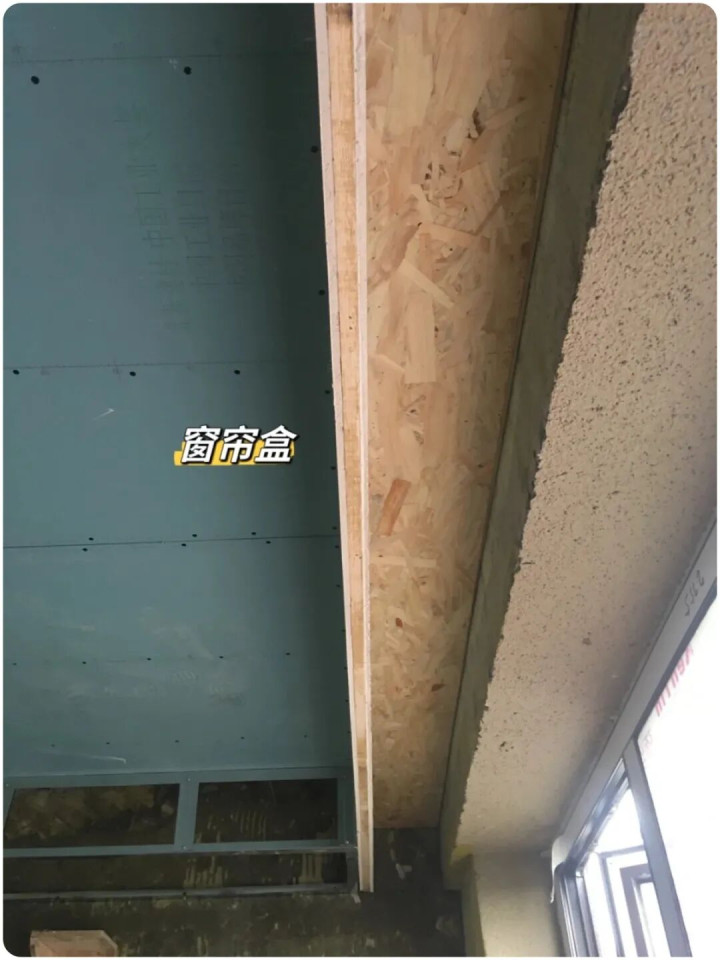 ▲制作窗帘盒时,底板和侧板都需要欧松板衬底,再覆盖石膏板,没有底板的窗帘盒是偷工减料,装轨道时易损坏基础腻子层。