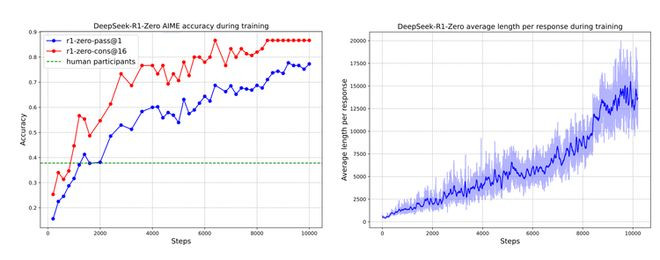 更值得关注的是人类baseline的引入。新版论文直接把R1的AIME成绩和人类参赛者的平均分放在一起比较。R1-Zero在训练过程中,pass@1从15.6%一路涨到71.0%,使用多数投票后达到86.7%,超过了人类平均水平。