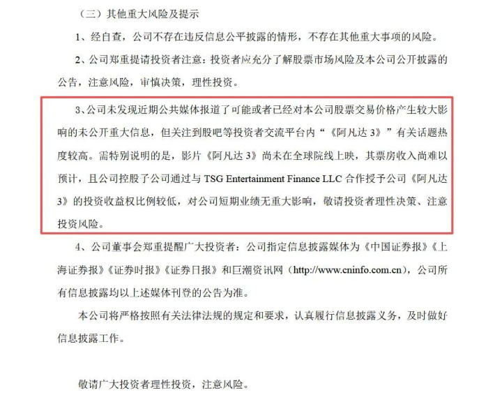 《阿凡达3》上映前,博纳影业曾走出“5天4板”的大涨行情。12月15日,博纳影业发布公告表示,关注到股吧等投资者交流平台内“《阿凡达3》”有关话题热度较高。需特别说明的是,影片《阿凡达3》尚未在全球院线上映,其票房收入尚难以预计,且公司控股子公司通与TSGEntertainmentFinanceLLC合作授予公司《阿凡达3》的投资收益权比例较低,对公司短期业绩无重大影响,敬请投资者理性决策、注意投资风险。12月22日早盘,影视院线板块盘初走弱,博纳影业跌停。