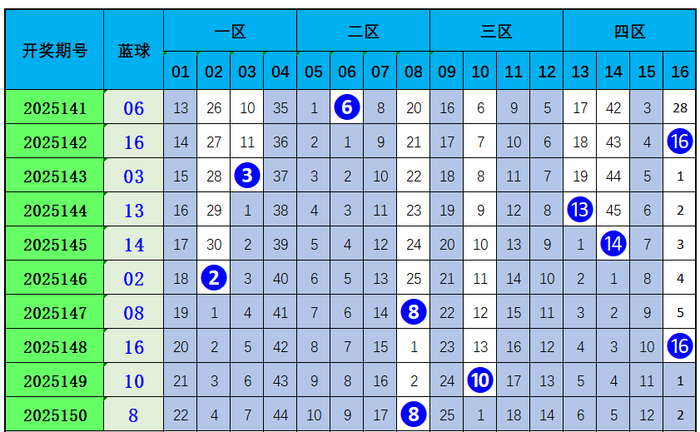 最近10期蓝球号码分别开出06、16、03、13、14、02、08、16、10、08,大小比为5:5,本期预测开出小数蓝球号码:05。