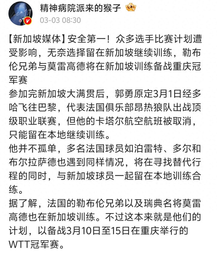 虽然新加坡大满贯已结束,但世界排名高的选手要参加重庆冠军赛,由于中东局势很动荡,很多欧洲选手从卡塔尔转航班都受到了延误,所以就干脆留在了新加坡备战。泊雷特、多尔、布尔拉萨德这三个法国选手不参加3月10日举行的重庆冠军赛,也是等航班恢复之后再返回法国的俱乐部去打比赛。由于WTT赛事在全世界不同地点举办,所以很多距离较远的选手就要调整时差,合理安排赛程。
