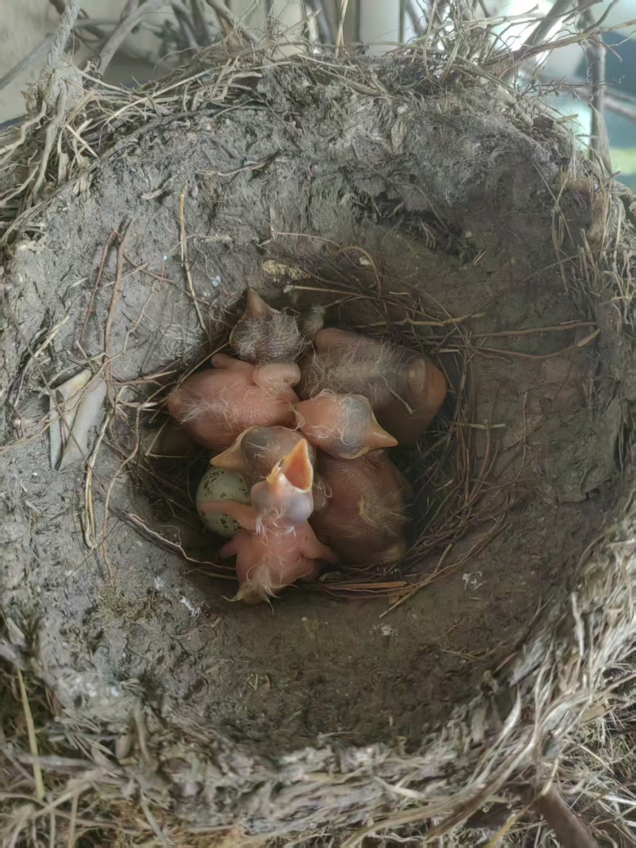 这份善意的保留,在今年3月得到了“回报”。陈先生惊喜地发现,那对乌鸫夫妇如约而至,再次回到了这个“老地方”,并在巢中产下了5枚鸟蛋。“大小和花纹跟去年的一模一样,我就知道是它们回来了!”陈先生兴奋地说。不久后,其中4枚蛋成功孵化,但遗憾的是,有一只雏鸟不幸夭折,让陈先生颇为心疼。记者在巢边看到些许血迹,他推测可能是附近其他鸟类(如斑鸠)侵扰所致。