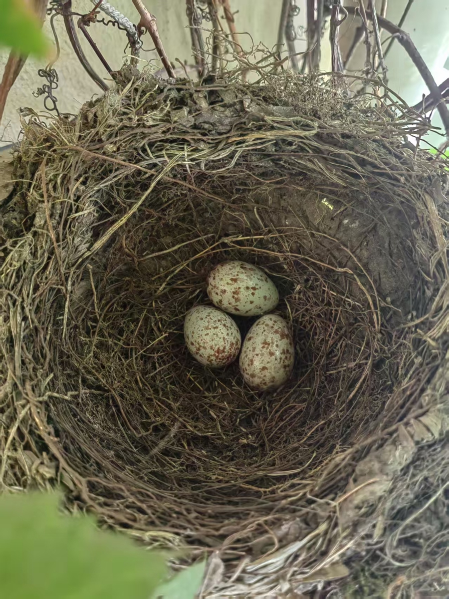 “去年6月,我第一次发现它们在这里安家。”陈先生回忆道,当时巢里有一只刚出壳的雏鸟和两枚鸟蛋。为了不打扰它们,陈先生和家人刻意减少了阳台活动,静静等待。一个多月后,雏鸟离巢飞走,但那两枚未孵化的蛋却留在了巢中。尽管“鸟去巢空”,陈先生却没有拆除这个精致的鸟巢,而是选择将它保留下来。后来查阅资料,他才知道这位“不速之客”是善于鸣叫的乌鸫,俗称“百舌鸟”。